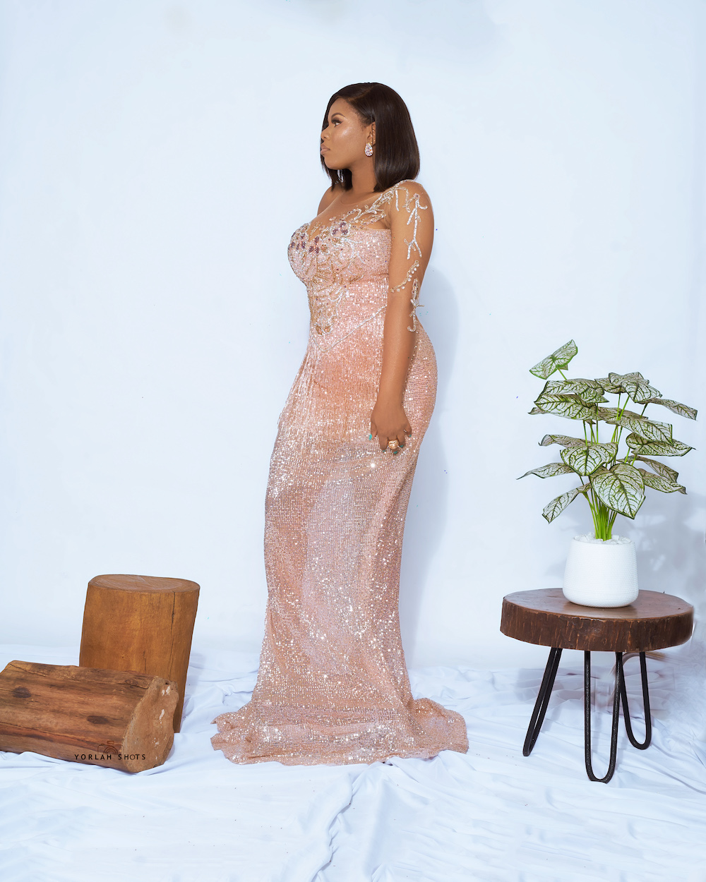 Bedazzled sequin rose/ soft peach coloured red carpet dress with beaded fringe detail and nude mesh. Lace up inner corset.