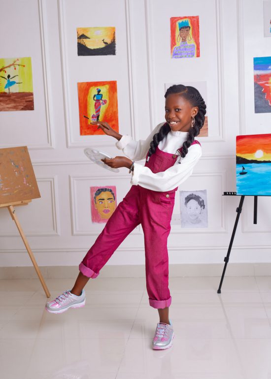 I decided to dress Fran in cute and comfy dungarees for her art scene. With pink being the celebrant’s fave color, it was easy to select the perfect sneakers to match her outfit from the various pink options in her closet. Fran spent the week before the photoshoot painting and sketching several masterpieces which serve as the colorful backdrop behind her.